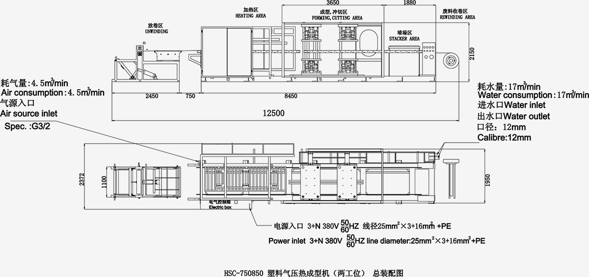 HSC-750850 型高效程控塑料氣壓熱成型機,運用國際最新塑料片材成型工藝技術,是集機、電、氣一體化設計,采用微電腦及可編程控制器 (PLC) 控制,人機界面操作,隧道式曲面漫輻射加熱,凹凸模皆可成型,激光刀片沖切,加熱、成型、沖切、堆垛分四工位,同時運行等先進技術(shu)。即送(song)片、加熱、成型、切邊、堆垛一次完成的塑料(liao)片材(cai)成型設備。